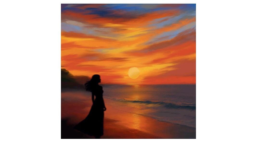 perempuan yang berdiri di tepi pantai saat matahari mulai terbenam. Ia