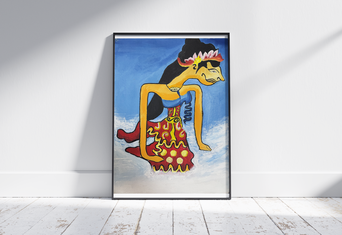 stilisasi dengan busana tradisional dan latar biru yang tenang. Bentuk tubuh