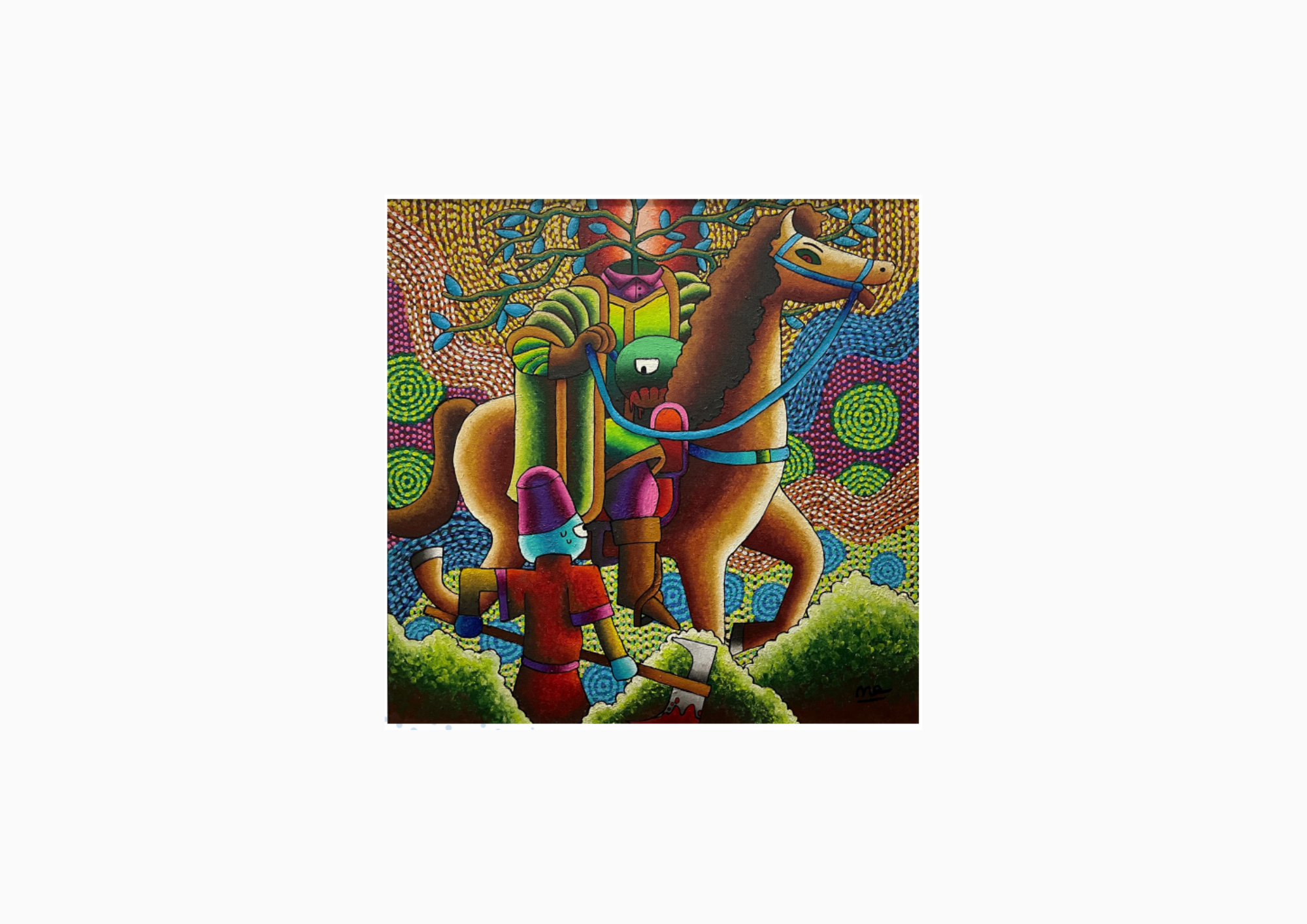 Dalam pameran tunggal bertajuk Unspoken: Antara Ingatan dan Imajinasi, Airlangga Satryatama Wisnumurti menghadirkan sebuah karya provokatif berjudul "The Green Knight" (2025). Lukisan akrilik di atas kanvas ini menangkap momen simbolis dari sebuah adegan pemenggalan kepala, namun alih-alih menampilkan kengerian, ia justru menawarkan sebuah pemahaman baru tentang kehidupan.